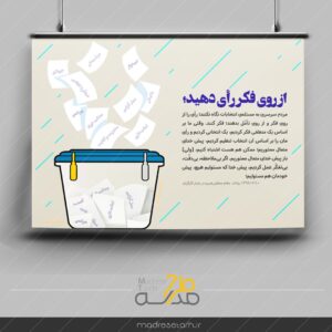 این پوستر ویژه انتخابات، بهماهیت و اهمیت انتخابات توجه ویژه دارد و با طرحی جذاب و حرفهای، در فضای مدارس، دانشگاهها، شهرستانها و مراکز عمومی، نقشآفرینی مؤثری در جلب توجه و تشویق مردم برای مشارکت در فرآیند رأیگیری دارد. نصب این پوستر در فضاهای رسمی و عمومی، میتواند پیام استقلال، رای و مسئولیتپذیری را در جامعه تقویت کند و مردم را به مشارکت فعال در فرآیندهای دموکراتیک ترغیب نماید.