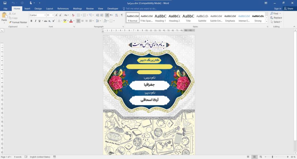 جلد دفتر حضور وغیاب کلاس جغرافیا قابل ویرایش با نرم افزار آفیس (Word)