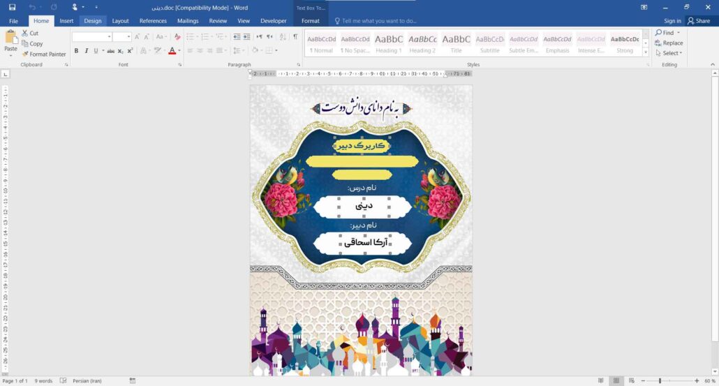 جلد دفتر حضور وغیاب کلاس دین و زندگی قابل ویرایش با نرم افزار آفیس (Word)