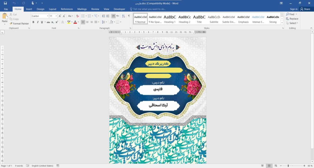 جلد دفتر حضور و غیاب کلاس درس فارسی قابل ویرایش با نرم افزار آفیس (Word)