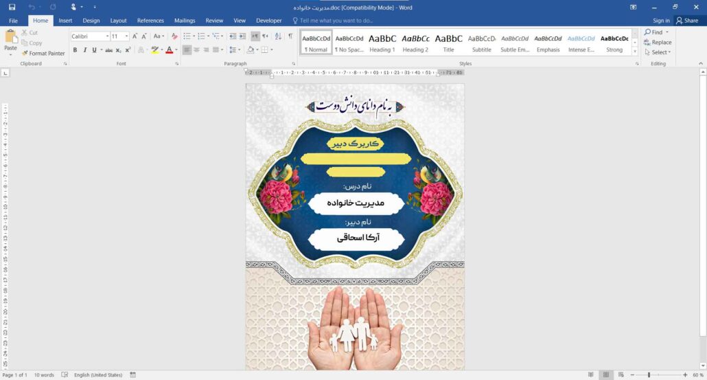 جلد دفتر حضور و غیاب کلاس درس مدیریت خانواده قابل ویرایش با نرم افزار آفیس (Word)