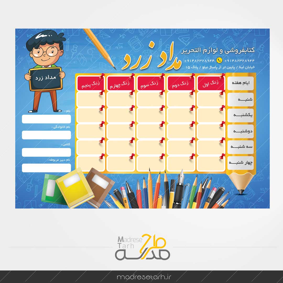 بهمین جهت مدرسه طرح سعی در طراحی نوشت افزارهای فرهنگی بخصوص برنامه هفتگی درسی با موضوعات مرتبط با مدرسه با ویژگی لایه باز جهت استفاده مدیران فرهنگی نموده است. طرح لایه باز برنامه کلاسی با هویت بصری فرهنگی و همچنین معرفی یک مدرسه برای شما ارائه شده که شما میتونید از قالب آن استفاده کنین. محتوای خاص خودتون رو بگذارید. در واقع برنامه کلاسی با طرحی از شهید مد نظر خوتون بگذارید. این طرح ها رو میتونید با جنس مقوایی چاپ کنین که خط کش مورد نظر استحکام خوبی داشته باشه.این محصولات رو میتونید توی مراکز فرهنگی و هنری ارائه بدید.